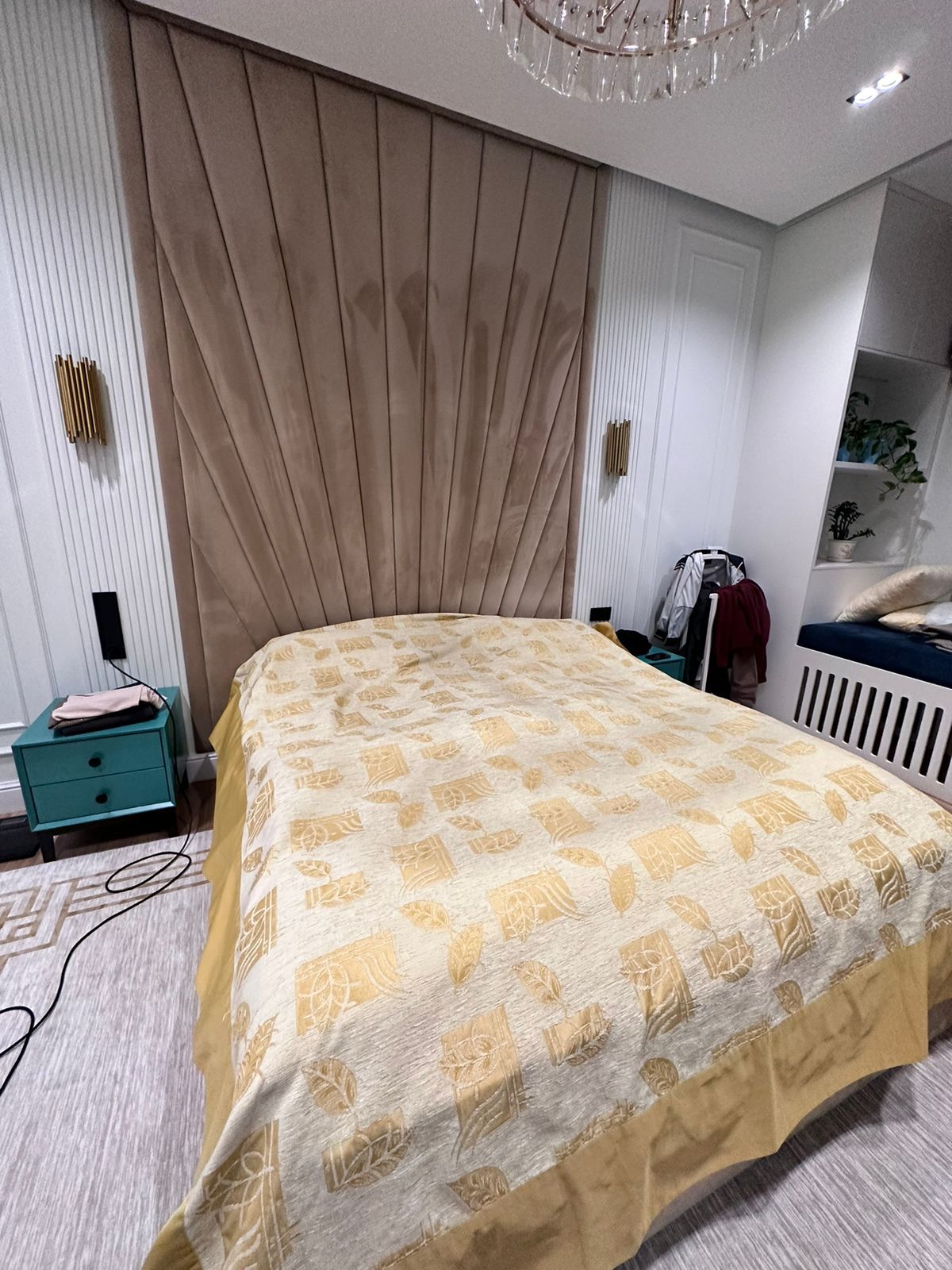 ReNew Studio ұсынған сәнді жұмсақ төсек. Жоғары панельді бас тақтасы бежевый матамен қапталған. Жатын бөлмеге талғампаздық пен жайлылық береді, интерьердің орталығына айналады.
