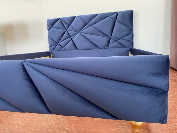ReNew Studio ұсынған заманауи көк велюр төсек. Дизайнерлік геометриялық бас тақтасы және драпталған негізі бар. Жатын бөлмеге талғампаздық пен бірегейлік беретін стильді әрі ерекше таңдау.