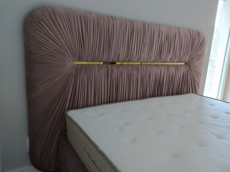 ReNew Studio ұсынған сәнді жұмсақ төсек. Розово-лиловый матамен қапталған, алтын сәндік элементі бар жоғары қатпарлы бас тақтамен безендірілген. Қазіргі заманғы жатын бөлмеге талғампаздық пен сән қосады.