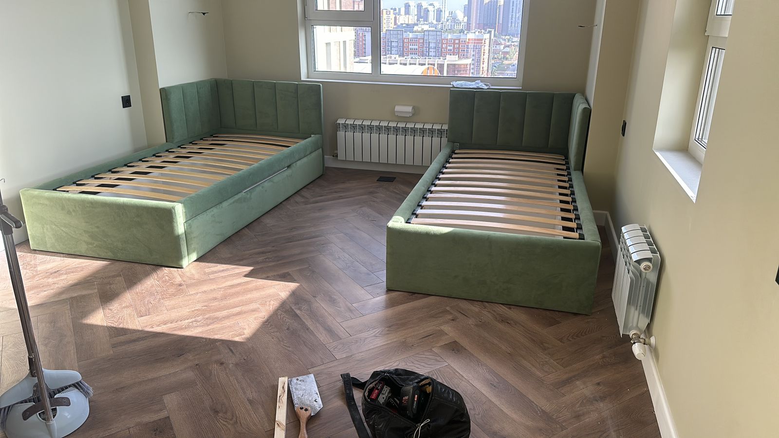 Two custom upholstered twin beds in green fabric, each with a corner headboard and wooden slats. Designed and made in Los Angeles by ReNew Studio.